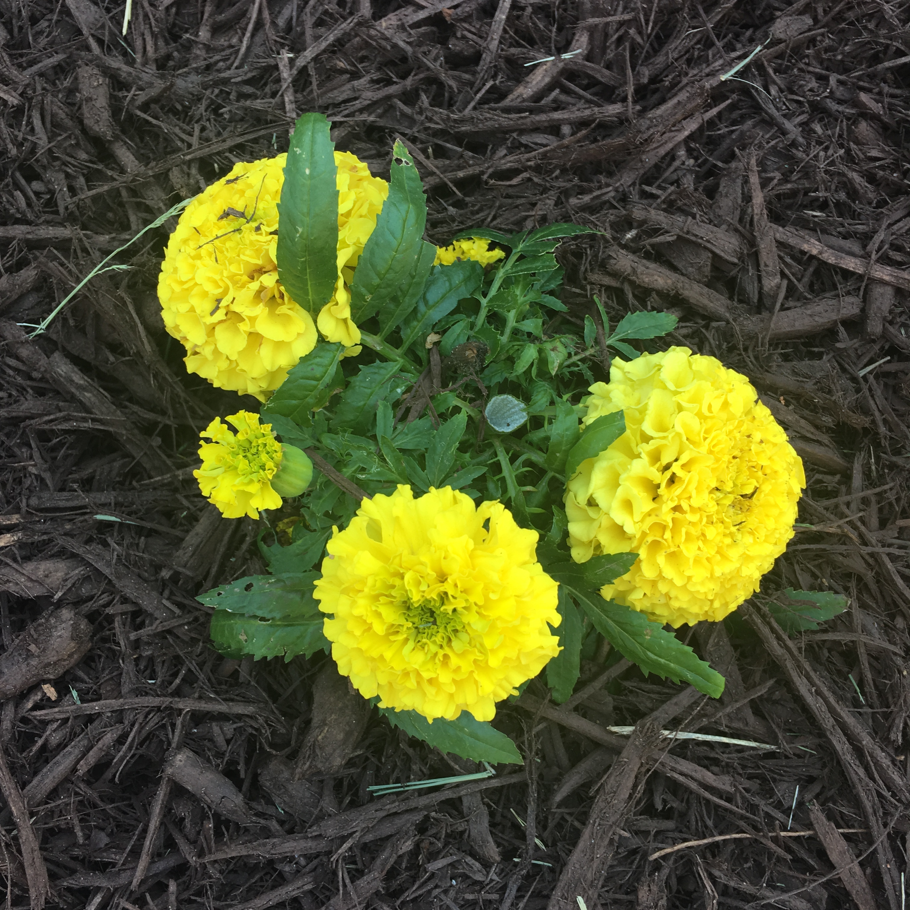 Is there anything more cheerful than a marigold? (Ok maybe his big brother, Sunflower, but it’s not sweet little Marigold’s fault he’s vertically challenged). The round yellow heads just keep popping up with little fuss. My kind of flower. And I’m loving this variety I found at Lowe’s Home Improvement this year. Proud Mari indeed! I originally bought them to use as centerpieces at a church preschool function, but they found their way to my front flowerbed. Together with their friends, pink verbena, they have brightened up the front of our house considerably. And brightening is needed because our house is…well…brown. In fact my whole neighborhood is brown. It’s a theme.