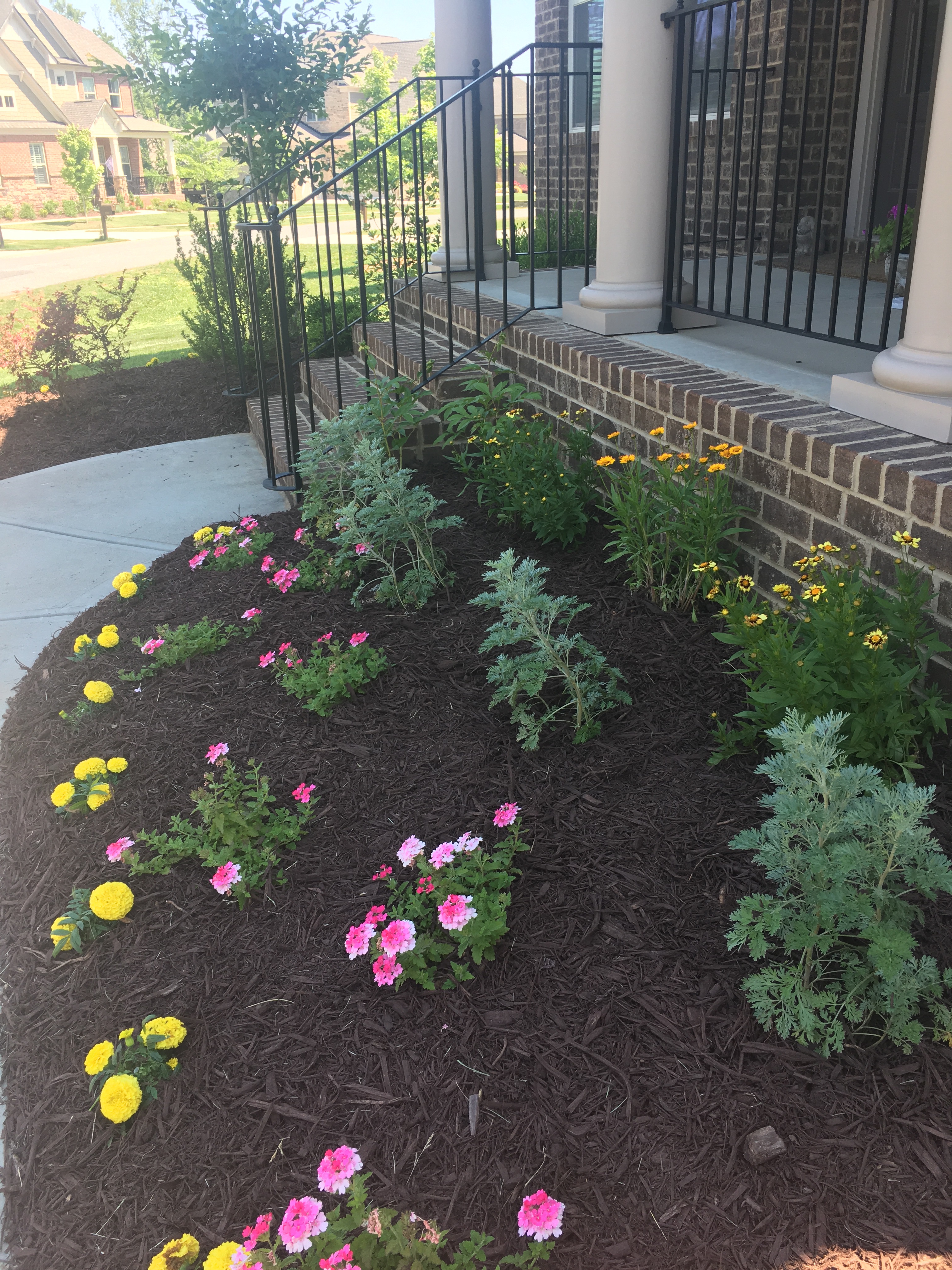 The front yard of our brown house is planted with typical builder-choice plants: boxwoods and hollies, a few loropetalum and one lovely crepe myrtle. And the always southern choice, azaleas. We had several small scraggly azaleas right at the front steps who met their demise during an ice storm just a few weeks after we moved in. A sheet of ice came sliding off the porch roof and basically beheaded them. Come spring the yard man, not my husband, wanted to put in more azaleas but I said NO. For one thing it was not a great place for them anyway since it gets full, direct, hot sun about 29 hours a day, and second of all I had other plans. I’ve always got other plans. Perennials were on my mind, with a few annuals thrown in to keep it fresh. So I spent a couple of very pleasant spring days putting in my marigolds and verbena plus some backdrop coreopsis and artemisia. And a couple of peonies since I LOVE LOVE LOVE peonies. It makes me soooo happy to go out front and see my brown house starting to smile. Because that’s what flowers are…..a smile on the face of your home.