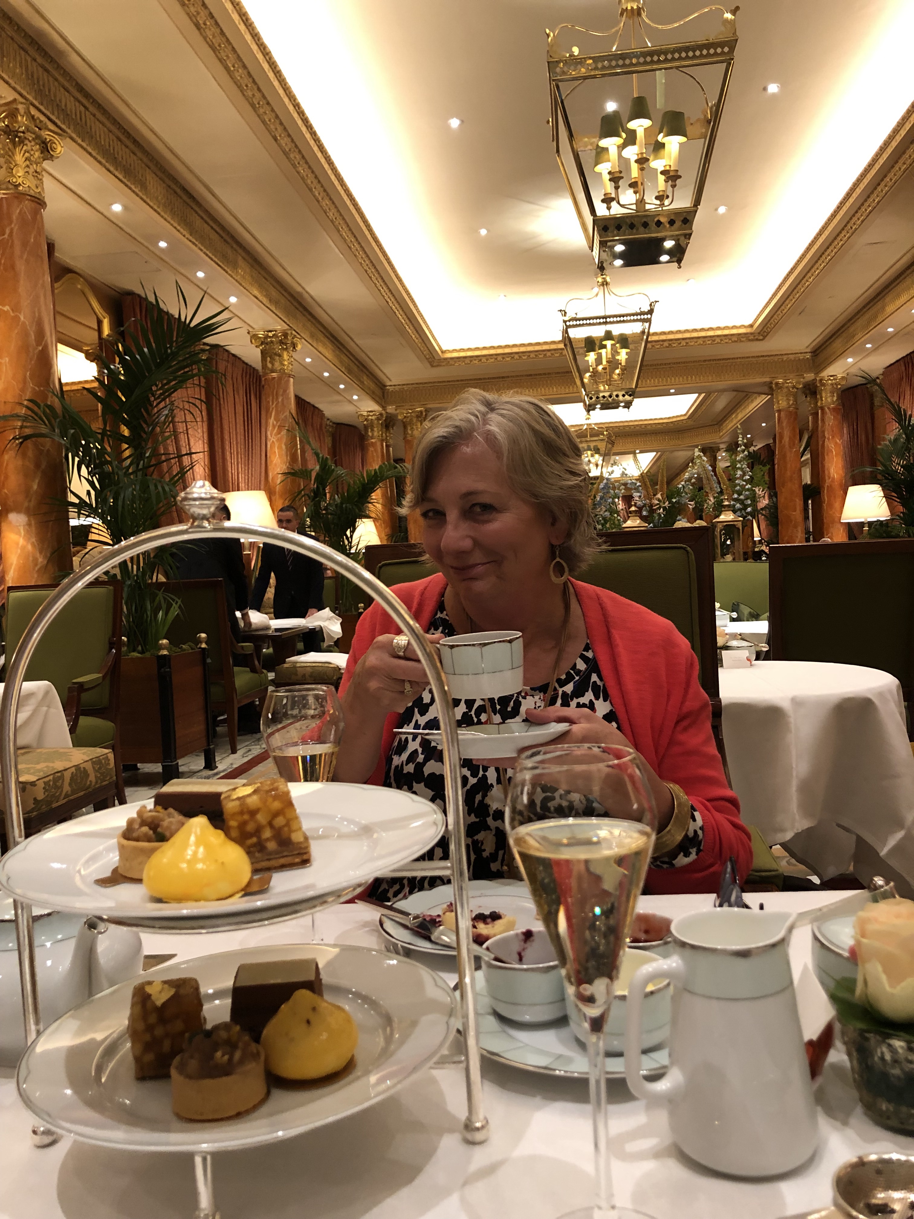 Back to our tea….it was amazing. Even my hubby, who probably would have rather watched bad British TV, admitted it was fun and delicious. The Dorchester was fabulous, with HUGE fresh flower arrangements everywhere. From the champagne to the savories, the tea to the sweets, it met every expectation. We were both stuffed by the time we finished and had to wonder how you could do this everyday and then still eat dinner at some later hour. But guess what? Yep, we saw people in trainers! Gasp! And nobody asked them to leave. I was indignant; I’m a rule follower! I was ready to politely point this out to someone in charge. Thankfully, my tea-mate asked for another curry finger sandwich and distracted me. But let it be known….we DID NOT wear our trainers to high tea at The Dorchester and our feet survived to tell about it.